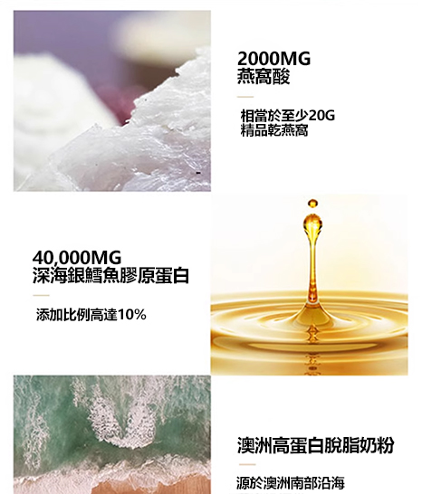 相當於至少20g精品乾燕窩),澳洲高蛋白脫脂奶粉(源於澳洲南部沿海黃金奶源帶)